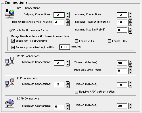If you have an active server and notice that your outgoing mail queue is getting large, you can increase this number. If you allocate more connections, be sure to increase the WebSTAR memory partition by an additional 10K of RAM per connection.